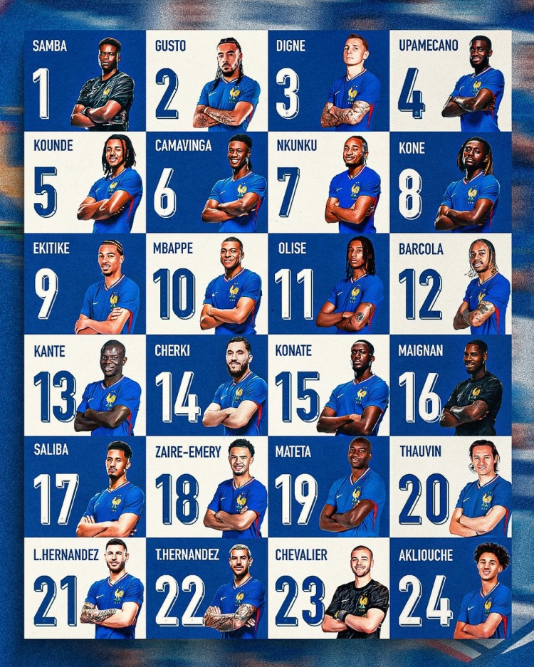后卫:2-古斯托、3-迪涅、4-于帕梅卡诺、5-孔德、15-科纳特、17-萨利巴、21-卢卡斯·埃尔南德斯、22-特奥·埃尔南德斯