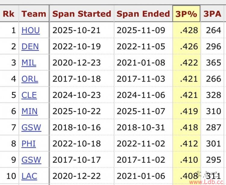 而且,火箭赛季前9场的三分命中率为历史最佳,此前纪录是21-22赛季掘金的42.6%。