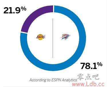 ESPN预测本场胜率,背靠背作战的雷霆胜率仍高达78.1%,湖人只有21.9%。