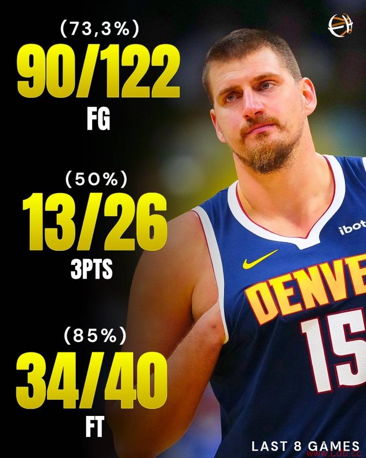 零点吧11月13日讯 过去八场比赛,约基奇场均得到28.5分13.1篮板11.1助攻,命中率73.2%,三分命中率50%,罚球命中率85%。