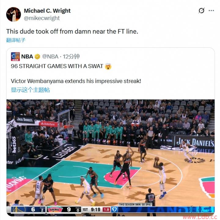 对此,ESPN篮球记者Michael C. Wright惊呼:“这家伙从罚球线附近就起飞了!”
