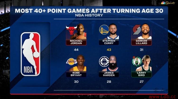据统计,这是库里30岁后第43次砍下40+,NBA历史第二多,仅次于乔丹(44次)
