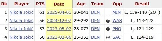 据统计,这是约基奇生涯第5场50+,生涯首场50+且赢球,此前4次皆负。