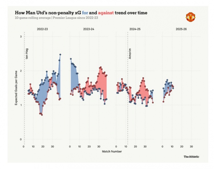 如下图表所示,曼联预期进球数据正稳步上升。虽距滕哈赫首季巅峰尚有差距,但长期赤字后已显现稳定蓝线,这也促成了帅位更迭。