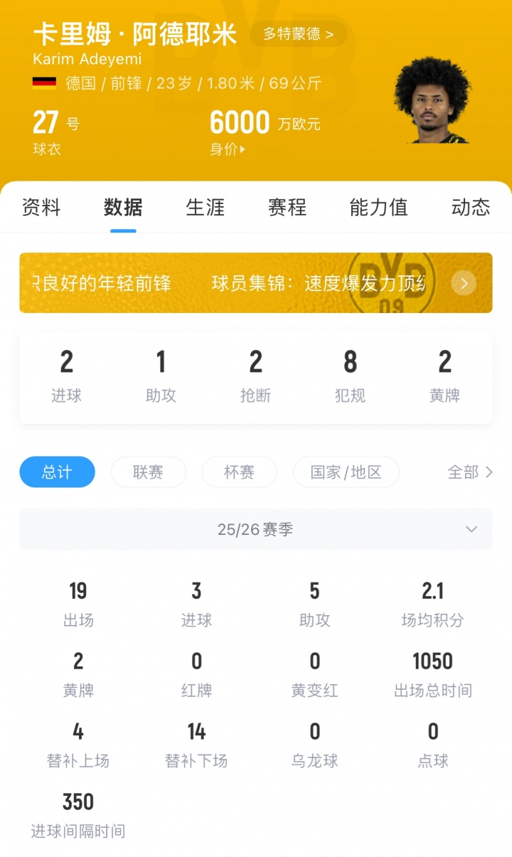 阿德耶米现年23岁,本赛季至今为多特19次,贡献3球5助,他与多特的合同将在2027年到期,现身价6000万欧。