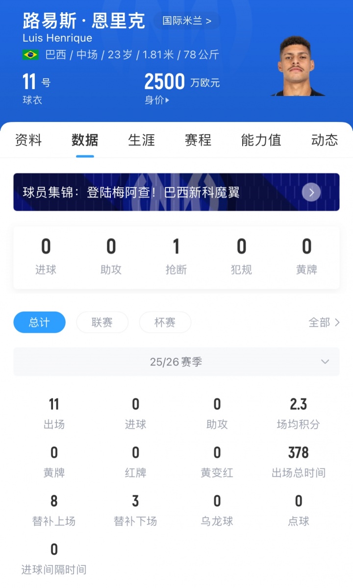 恩里克现年23岁,本赛季恩里克仅为国米登场11次共计378分钟,没有进球和助攻,他现身价2500万欧,与国米的合同在2030年到期。
