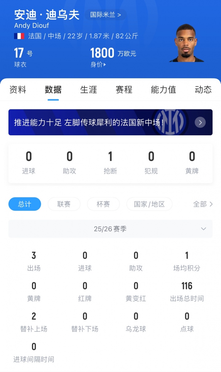 迪乌夫现年22岁,本赛季仅为国米出场3次,共计116分钟,没有进球和助攻,他现身价1800万欧,与国米的合同同样在2030年到期。