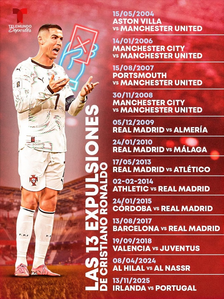 C罗生涯13次染红??:其中3次肘击,2次故意踢人,2次涉及假摔