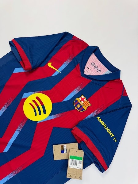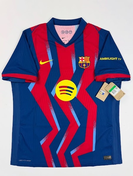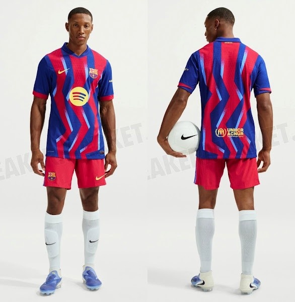 与20年前的经典蓝红条纹不同,巴塞罗那2025-26赛季第四球衣采用了蓝色和红色的锯齿形条纹,并带有浅蓝色的图形元素。