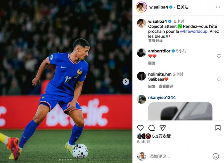 赛后,法国后卫萨利巴更新社媒晒照庆祝晋级世界杯,写道:目标达成?明年夏天世界杯见。加油,法国队 ????