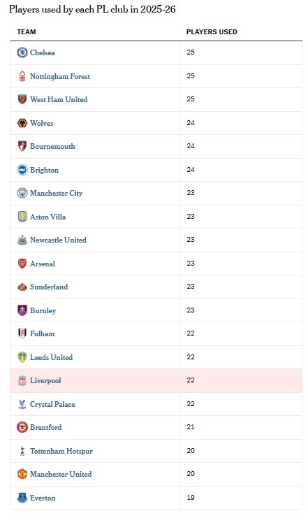 本赛季利物浦是英超轮换次数第六少的球队
