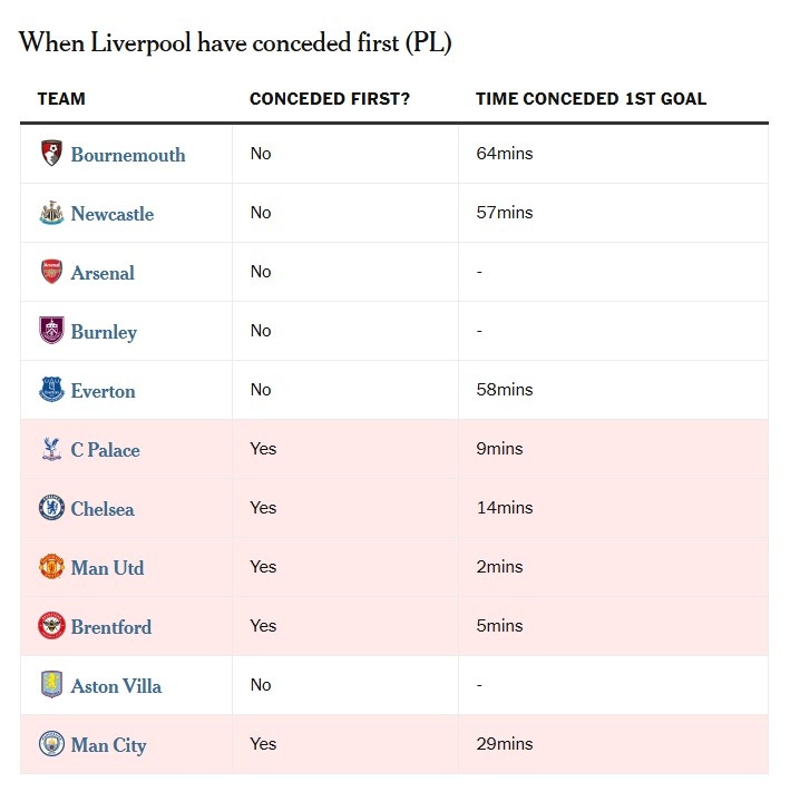 但本赛季情况完全相反。输给水晶宫、布伦特福德、切尔西、曼联和曼城的比赛,全都是利物浦先丢球导致的结果。