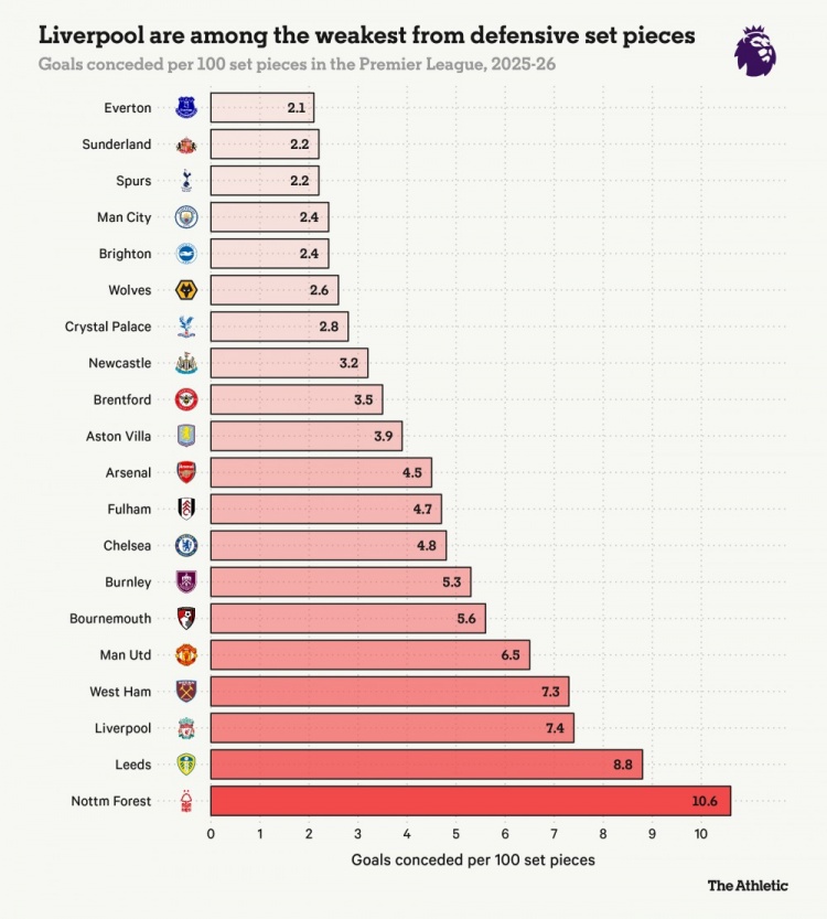 利物浦是本赛季英超定位球防守最糟糕的球队之一