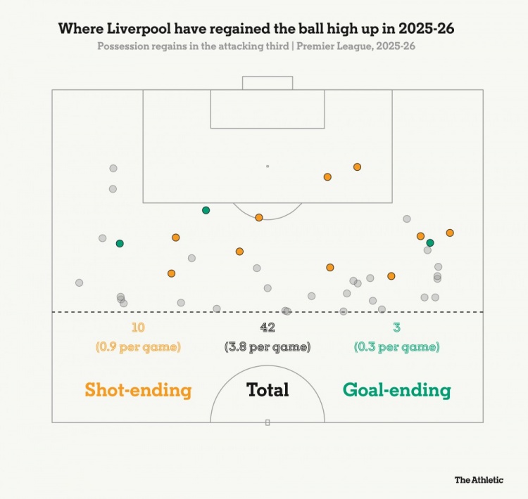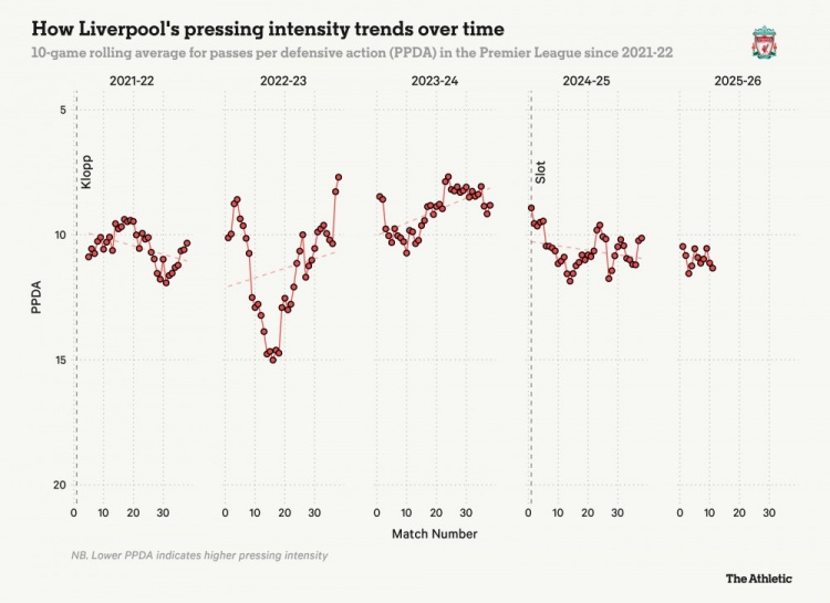 对手的战术风格也是一个因素。更多球队对阵利物浦时采用长传,这减少了红军实施高位压迫的机会;而较早丢球后,对手便无需在后场冒险,进一步限制了压迫的机会。