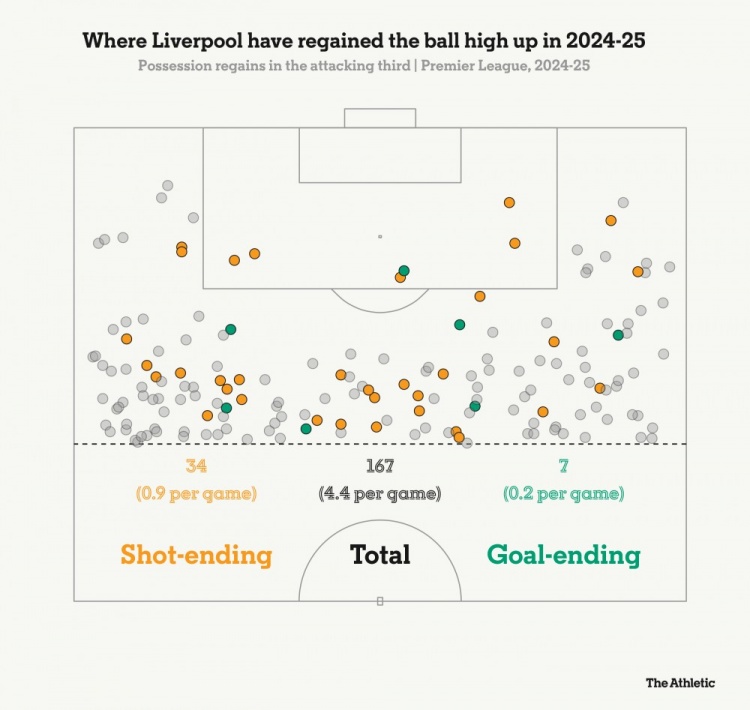 24/25赛季利物浦在前场反抢的位置分布