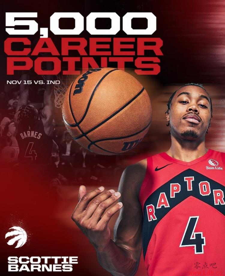 猛龙球星斯科蒂·巴恩斯已经得到2分,他的生涯总得分突破5000大关(赛前为4998分)。