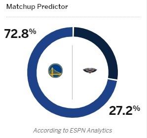 今日ESPN给出本场获胜概率预测,勇士72.8%,鹈鹕27.2%。
