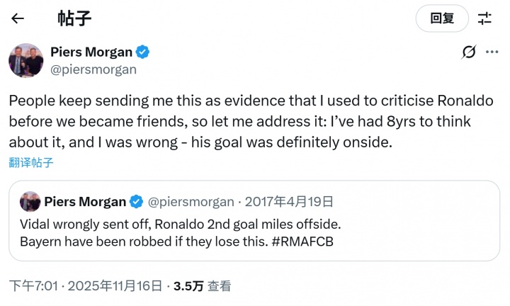 零点吧足球11月16日讯 今日著名主持人皮尔斯·摩根在社媒发文,对8年前自己的社媒言论进行道歉,表示自己曾经错怪了C罗。
