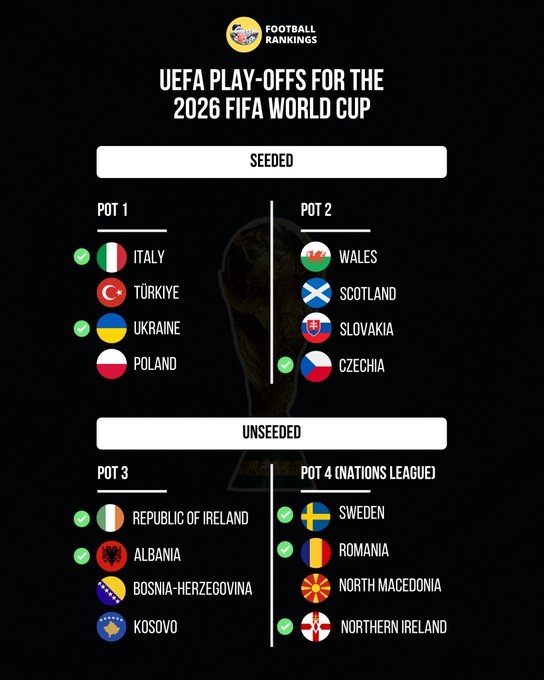据外媒Football Rankings报道,意大利已确认成为第一档种子队,将在附加赛半决赛主场迎战第四档球队,潜在对手及出现概率为: