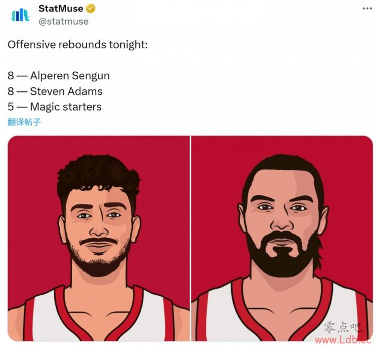 内线优势!申京和亚当斯各抢下8个前场板 魔术首发五人共5个