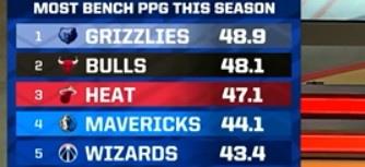 本赛季替补得分top5球队:灰熊48.9分领跑 公牛第2 独行侠第4