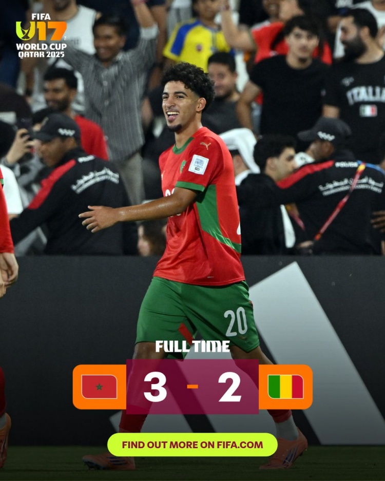 摩洛哥U17球员Ismail El Aoud此后连进两球,将场上比分改写为3-1,马里U17球员Tièmoko Berthe在下半场补时阶段打进1球,场上比分最终定格为3-2。