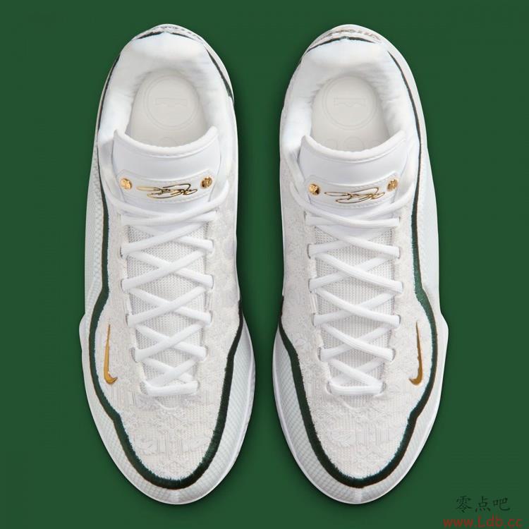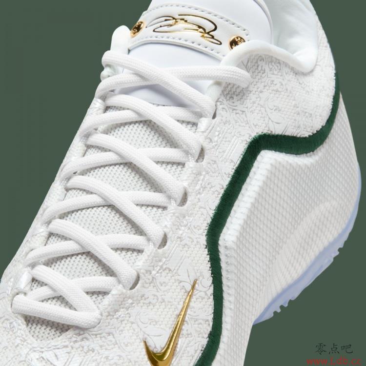 这款配色巧妙地融入了2002年《体育画报》封面上的元素,与詹姆斯高中时期所穿的球衣颜色相得益彰,清新的白色与充满生机的绿色交织,再搭配上鞋面精致的立体雕花,使得整个鞋款显得既经典又耐看。
