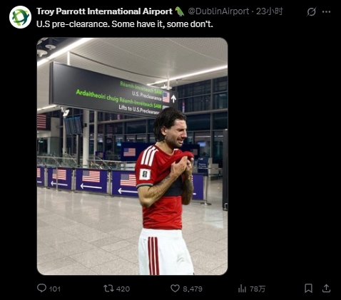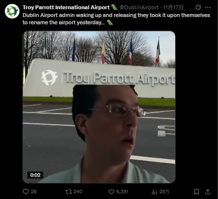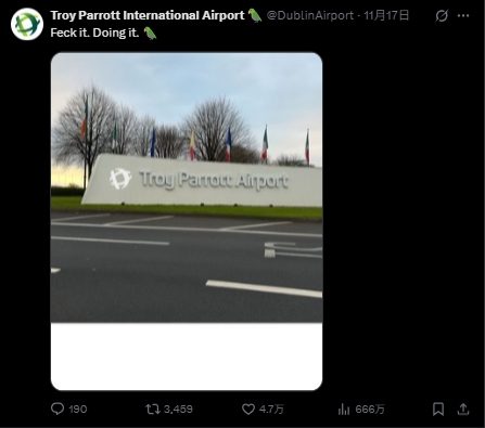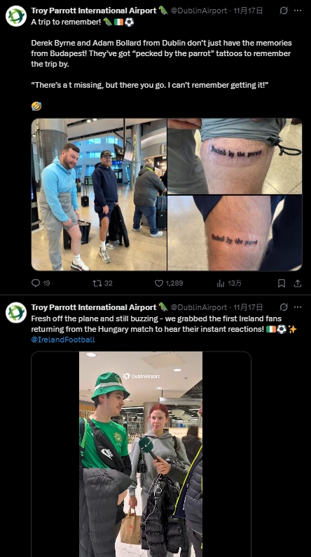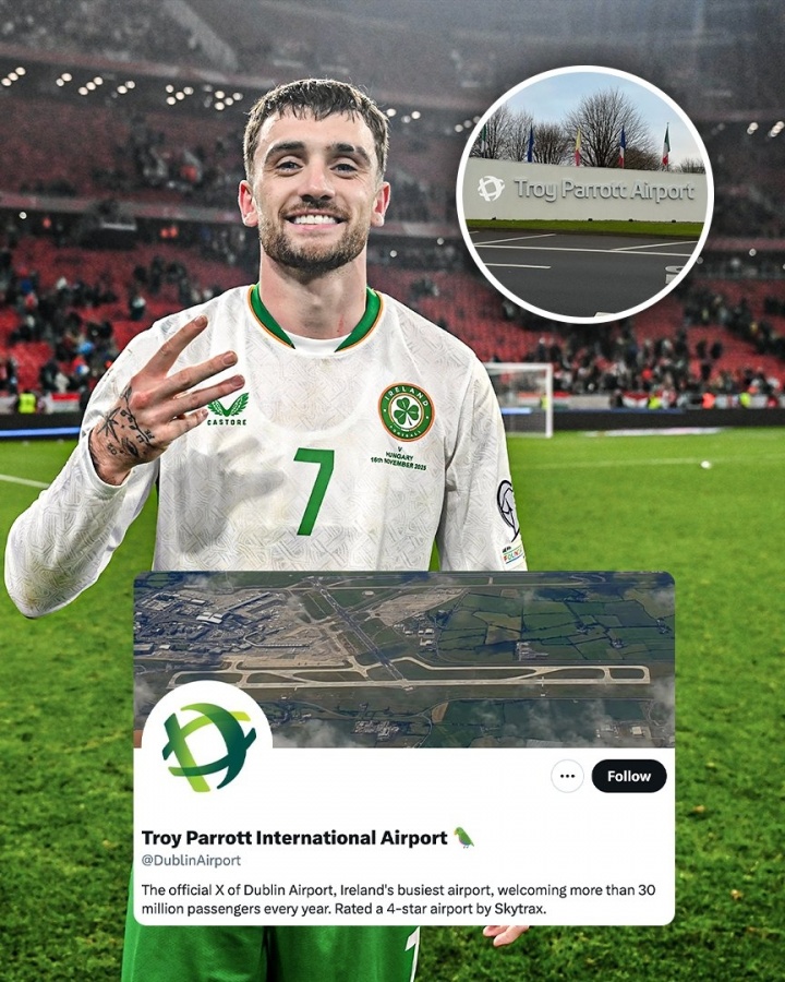 在爱尔兰最后3轮全胜,晋级附加赛的过程中,最后两场独进5球的前锋帕洛特无疑是最大功臣。对此,执行国家队迎来送往任务的爱尔兰都柏林机场开玩笑地将官方社媒名称改为“特洛伊·帕洛特机场”,并连发多条动态庆祝: