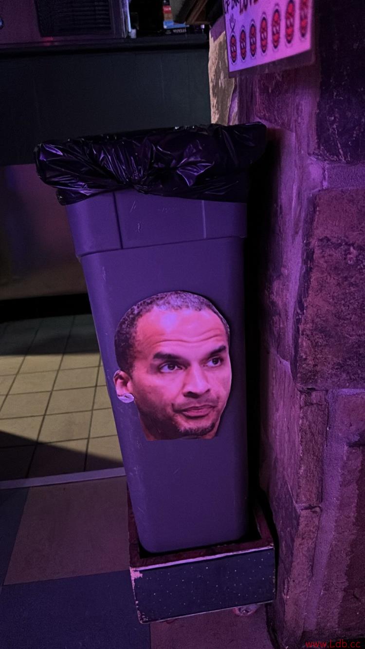 虾仁猪心!侠记晒照:达拉斯一酒吧外的垃圾桶上贴着哈里森头像