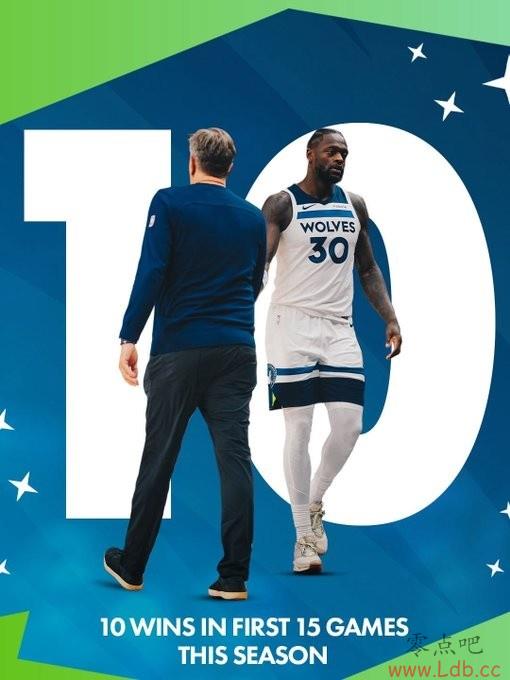 这是森林狼赛季第15场比赛,前15战他们取得10场胜利,森林狼官方数据统计,这是在过去20年第三次出现前15场10胜,其中两次是在芬奇教练麾下。