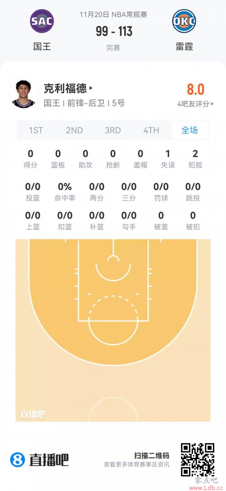 国王首轮24号秀尼克·克利福德 登场8.4分钟