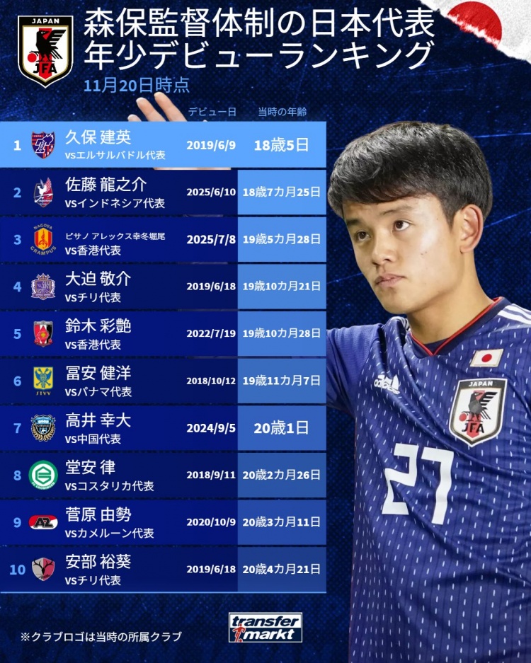 德转列森保一治下日本队最年轻出场纪录:久保建英18岁零5天居首