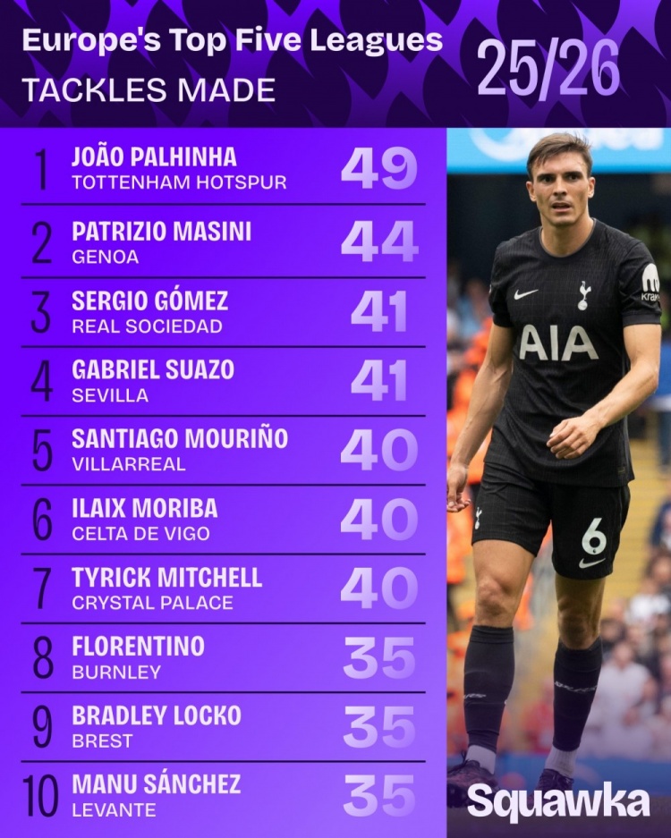 零点吧足球11月21日讯 Squawka统计了本赛季球员在五大联赛成功抢断的次数,并列出榜单,帕利尼亚49次居首。