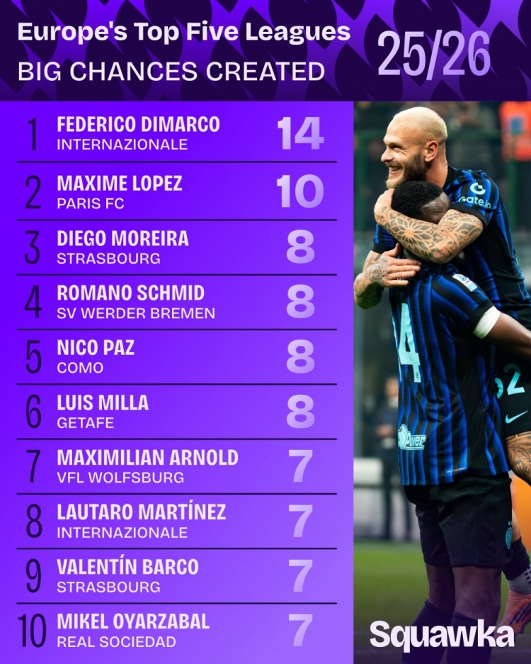 本赛季五大联赛创造重大机会榜:迪马尔科14次居首,帕斯8次第三