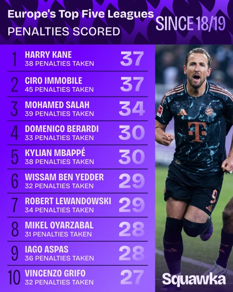 零点吧足球11月21日讯 Squawka统计了2018-2019赛季以来球员在五大联赛的点球进球数量,并列出榜单,凯恩、因莫比莱37球居首,萨拉赫34球第三。