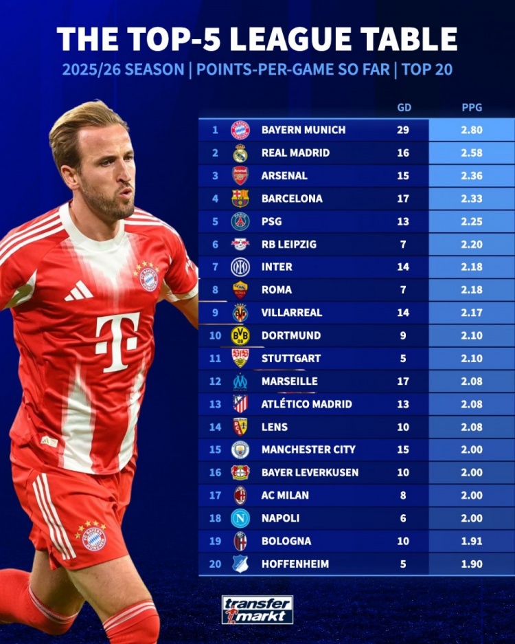 零点吧足球11月21日讯 五大联赛战火即将重燃,《转会市场》也统计了本赛季五大联赛球队场均拿分情况,拜仁独自领跑。