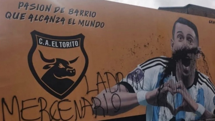 这幅壁画位于罗萨里奥北部的托里奥俱乐部,迪马利亚小时候曾在这里踢球。壁画的内容是迪马利亚在2022年世界杯决赛进球后的庆祝动作,旁边还有托里奥俱乐部的队徽。但本周有人用黑色喷漆破坏了壁画,并在一旁写着“小偷,雇佣兵”。