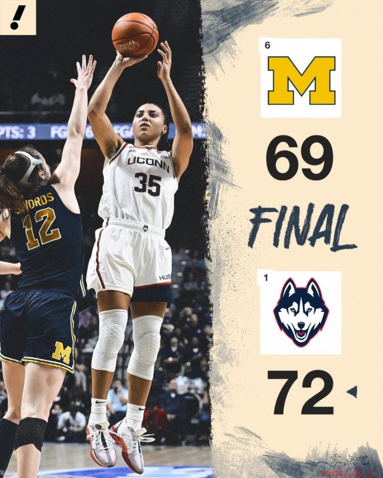 零点吧11月22日讯 NCAA常规赛,康涅狄克大学女篮72-69险胜密歇根大学。