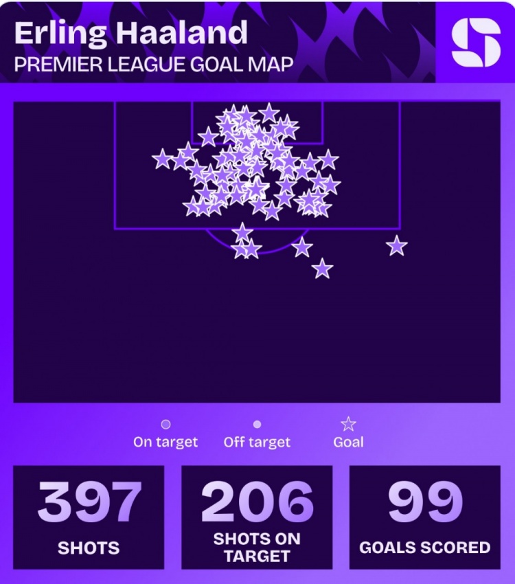 有望破希勒纪录!哈兰德英超射门397次、射正206次、进99球