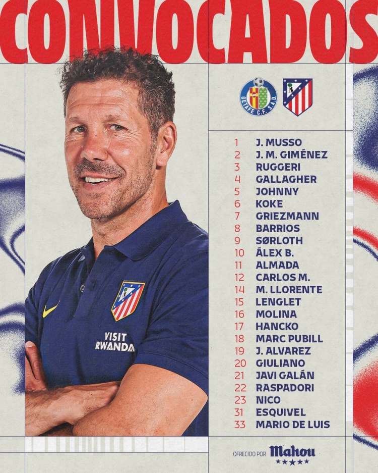 零点吧足球11月23日讯 北京时间明天凌晨1点半,西甲第13轮,马竞客战赫塔费,马竞公布了此役球队大名单。