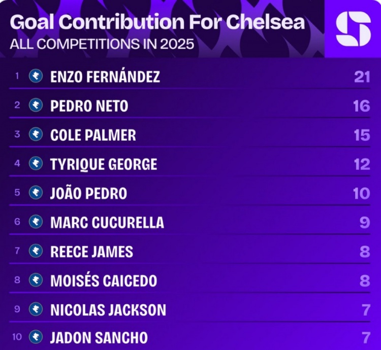 据Squawka统计,恩佐·费尔南德斯2025年打进11球,助攻10次,他是切尔西队内同期唯一进球、助攻皆上双的球员。