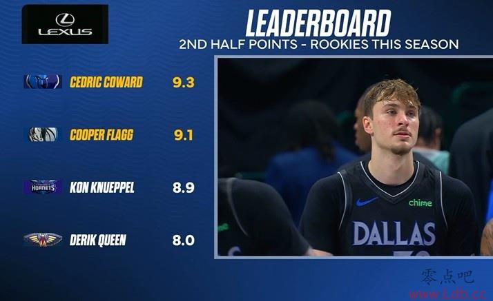 本赛季新秀下半场场均得分榜:科沃德9.3分最多 弗拉格9.1分第2