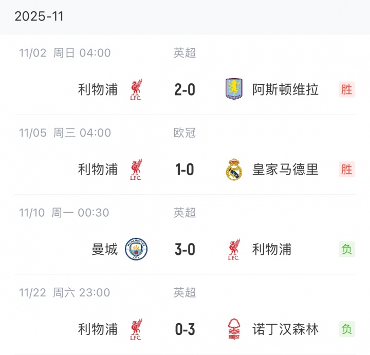 利物浦自9月27日以来战绩↓