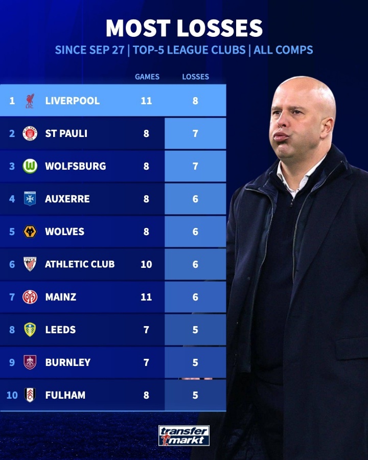 零点吧足球11月24日讯 德转统计了自9月27日以来五大联赛球队的输球榜,利物浦以8场比赛高居榜单第一位。