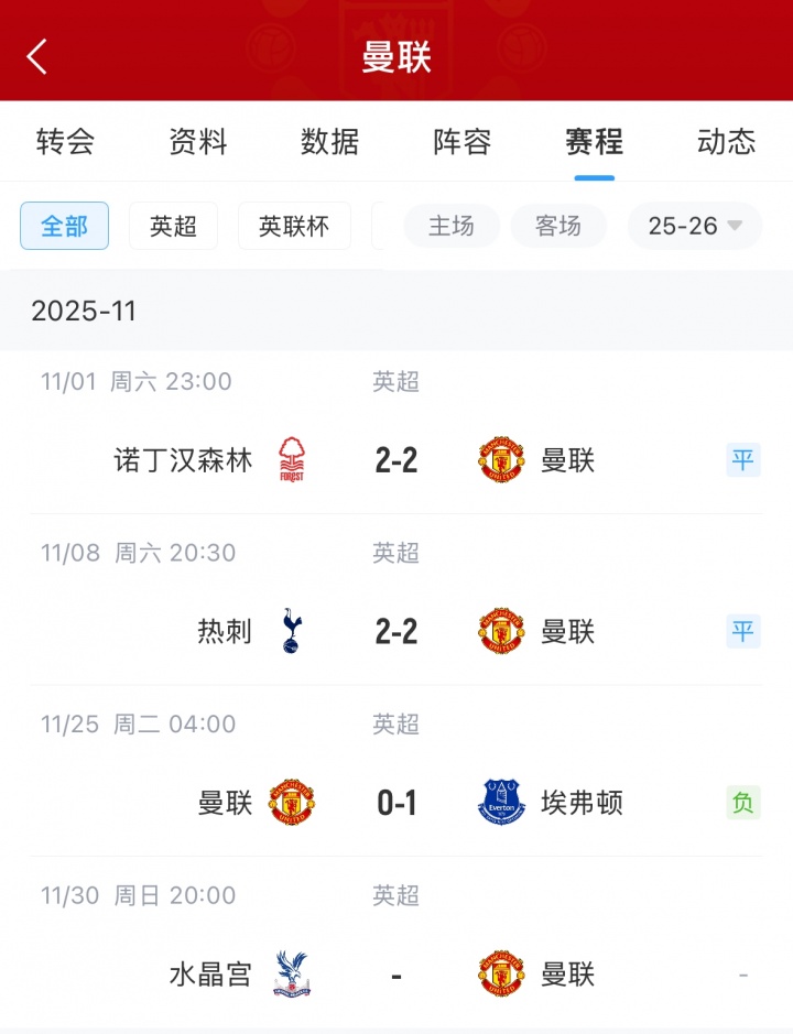 本月曼联3场英超2平1负,11月30日将客战水晶宫。