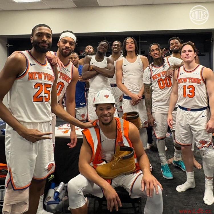 尼克斯战胜篮网,赛后球队评选哈特当选本场最佳防守球员,他在更衣室穿工地服装和帽子与队友合影。