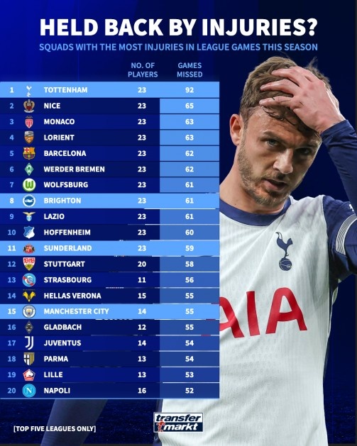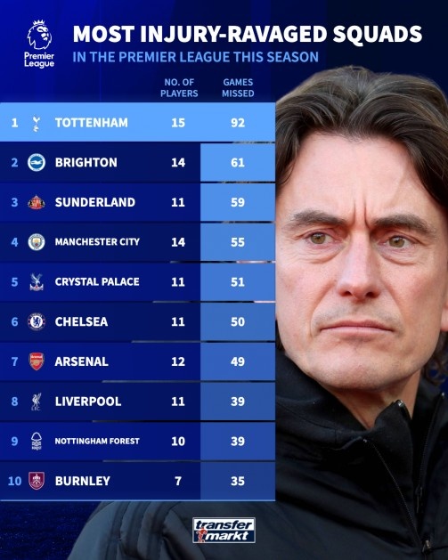 零点吧足球11月25日讯 德转列本赛季英超球队伤病榜,热刺15名球员受伤,共计缺席92场比赛排名第一,布莱顿、桑德兰位列二三位。