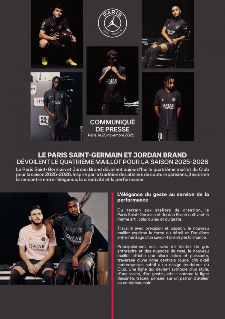 零点吧足球11月25日讯 官方消息,巴黎与乔丹品牌于今日公布了俱乐部2025-26赛季的第四款球衣。其设计灵感源自巴黎时装工坊的传统,诠释了优雅、创意与性能的融合。