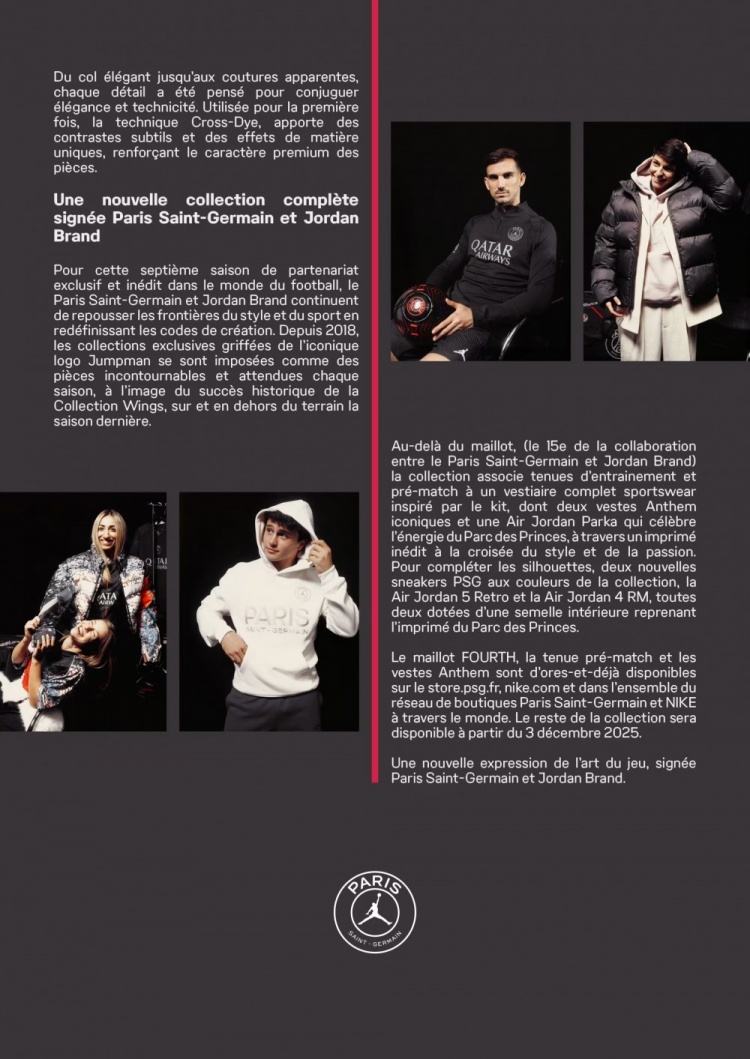 除球衣(这是巴黎与乔丹品牌合作的第15款球衣)之外,该系列还将训练服与赛前着装,同受比赛服启发的完整运动生活服饰相结合。其中包括两款标志性的Anthem夹克,以及一件以独特印花融合风格与激情、旨在颂扬王子公园球场活力的Air Jordan派克大衣。为完善整体造型,系列还推出两款以该系列配色为主题的新款巴黎运动鞋:Air Jordan 5 Retro和Air Jordan 4 RM,二者均配备印有王子公园球场图案的鞋垫。