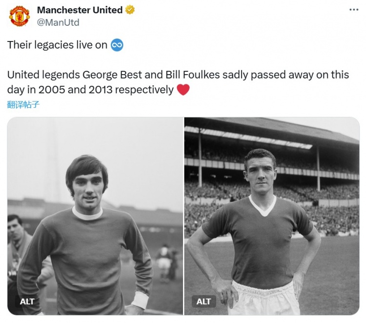 零点吧足球11月25日讯 曼联官方发文,纪念在11月25日离世的乔治·贝斯特以及比尔·福克斯。